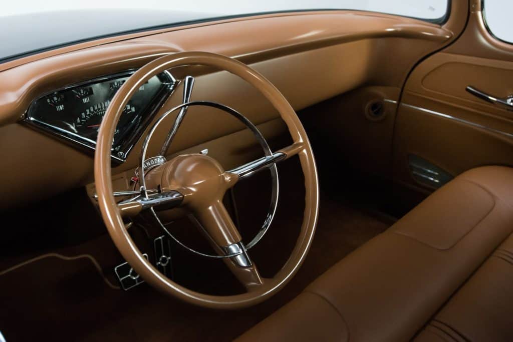 But the show doesn’t stop there. Not by a long shot! When you pop this pickup’s doors, you’ll find a detail-oriented cockpit with charmingly retro surfaces that were installed by Paul Atkins Interiors of Hanceville, Alabama. Top dead center, a matte dash hangs clean Classic Instruments gauges above hidden controls for modern air conditioning.