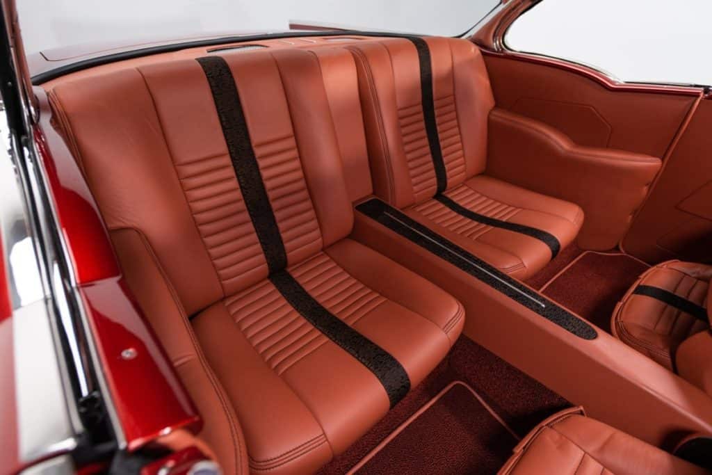 Between the doors, Chuck Hanna of Mooresville, North Carolina’s Hot Rod Interiors installed $12,933 of custom leather. Front and center, a quartet of French-stitched buckets feature throwback cloth stripes. In front of those seats, a smoothed dash wraps blackened billet around Dakota Digital VHX telemetry. At the base of that dash, a custom, full-length console centers Vintage Air climate control between chrome power window switches and a Bluetooth-capable Planet Audio head unit.