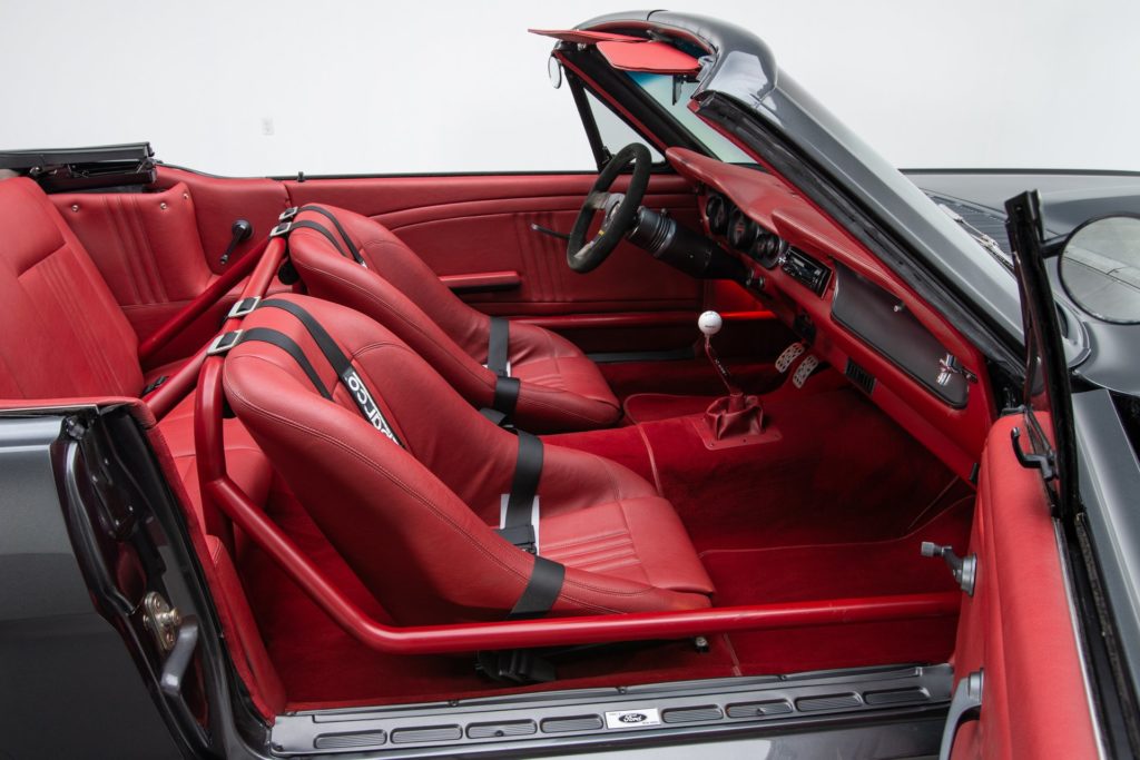 Back in the day, Ford designers made sure every year of the first generation Mustang had plenty of visual sizzle. Furthermore, this drop-bold top’s highlights and well-placed trim are 21st-century perfections. However, at the front of the car, a monochromatic mesh grille centers and HELLA driving lamps between modern headlights. In addition, there’s a Shelby-style valance and an aggressive chin spoiler.
