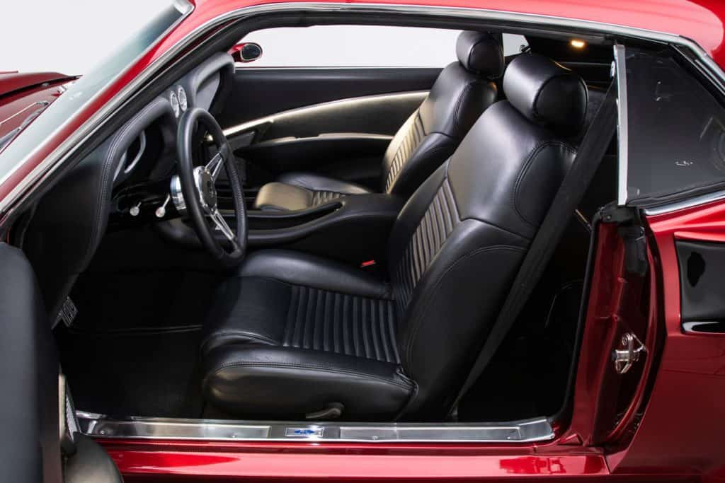 Ford’s Barracuda keyless entry leads to a customized cockpit with high-quality leather and improved equipment. In addition, a one-piece headliner with reading lights frames tall Mustangs To Fear buckets. A leather-wrapped dashboard features billet air vents, Dakota Digital telemetry, and American Autowire wiring.