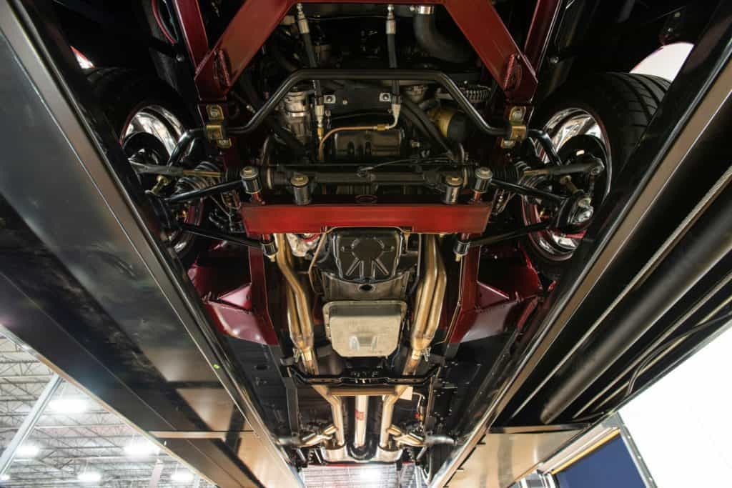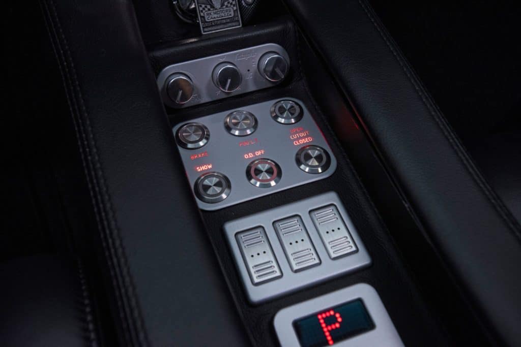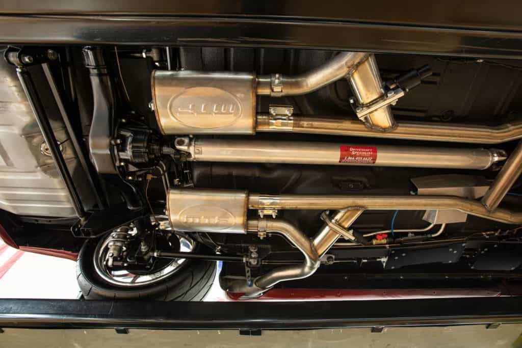 A leather-wrapped panel houses Vintage Air climate control, Watson’s StreetWorks power window, and door lock buttons. In addition, there are auxiliary power outlets and a Powertrain Control Solutions gear selector. Custom carpet floats color-keyed floor mats between billet foot pedals, thick RAPTOR Liner, and HushMat sound insulation.