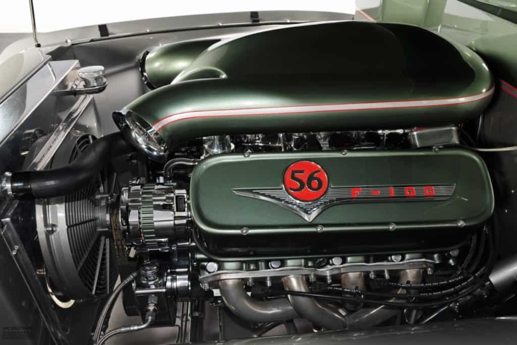 The 1956 Ford F100 Restomod’s 425 horsepower comes from a GM Performance Parts 454 cubic-inch big-block V8. The aim wasn’t to speed (though it’s fast), but to remove speed as a consideration. It’s quick. The goal was to make it fast and elegant, which it’s owing to custom-made valve covers and an intake shroud.