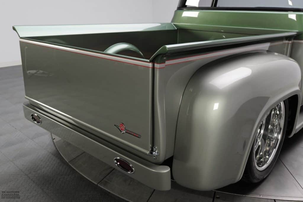 The custom-made green leather inside of the 1956 Ford F100 Restomod makes you forget it was originally a pickup truck. However, This truck has updated 2006 Nissan Altima gauges. Beautifully stitched seats, door panels, and floor mats provide a coherent motif, and the paint job details continue inside the truck.